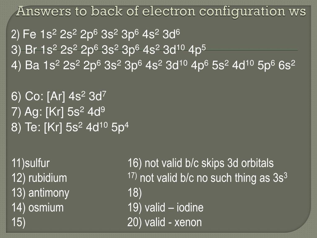 Answers to back of electron configuration ws 11)sulfur 12) rubidium 13) antimony 14) osmium 15) 16) not valid b/c skips 3d orbitals 17) not valid b/c no such thing as 3s3 18) 19) valid – iodine 20) valid - xenon 2) Fe 1s2 2s2 2p6 3s2 3p6 4s2 3d6 3) Br 1s2 2s2 2p6 3s2 3p6 4s2 3d10 4p5 4) Ba 1s2 2s2 2p6 3s2 3p6 4s2 3d10 4p6 5s2 4d10 5p6 6s2 6) Co: [Ar] 4s2 3d7 7) Ag: [Kr] 5s2 4d9 8) Te: [Kr] 5s2 4d10 5p4