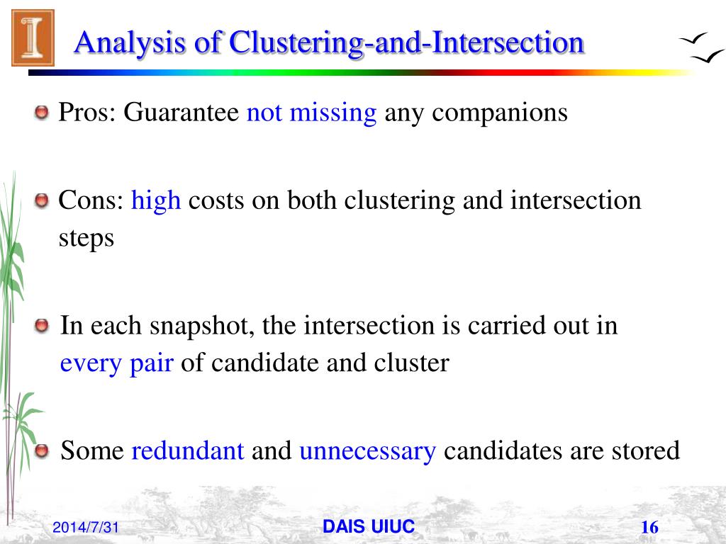 Analysis of Clustering-and-Intersection • Pros: Guarantee not missing any companions • Cons: high costs on both clustering and intersection steps • In each snapshot, the intersection is carried out in every pair of candidate and cluster • Some redundant and unnecessary candidates are stored