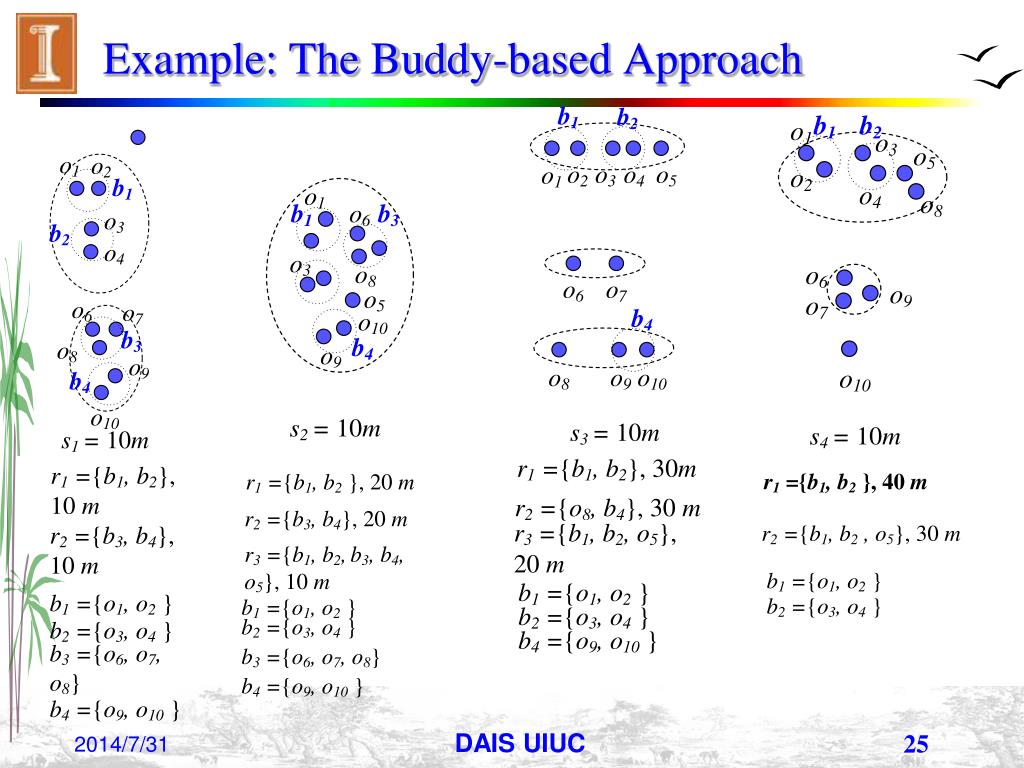 The Buddy-based Approach • Intuition: Speed up the clustering step by reusing the information of previous clusters • Observation: People, animal and other creatures like to travel within small groups – the buddies • Couples/close friends like to travel together • Animals migrate in families