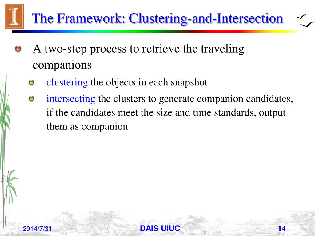 The Framework: Clustering-and-Intersection • A two-step process to retrieve the traveling companions • clustering the objects in each snapshot • intersecting the clusters to generate companion candidates, if the candidates meet the size and time standards, output them as companion