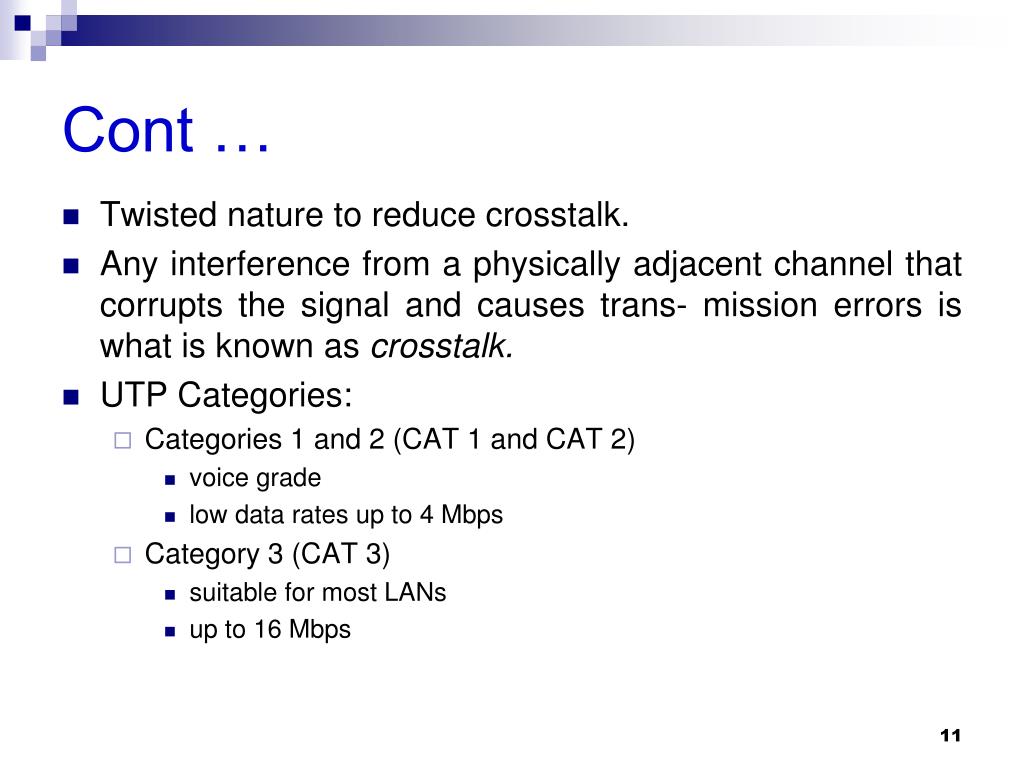 Cont … • Twisted nature to reduce crosstalk. • Any interference from a physically adjacent channel that corrupts the signal and causes trans- mission errors is what is known as crosstalk. • UTP Categories: • Categories 1 and 2 (CAT 1 and CAT 2) • voice grade • low data rates up to 4 Mbps • Category 3 (CAT 3) • suitable for most LANs • up to 16 Mbps