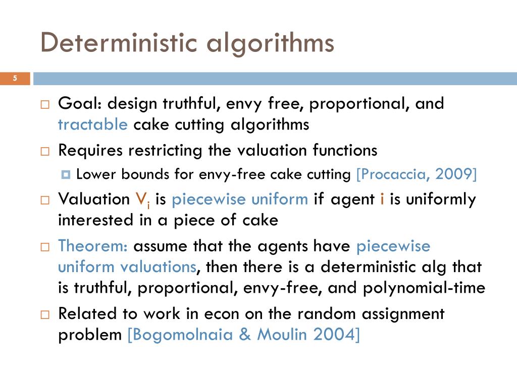 Deterministic algorithms • Goal: design truthful, envy free, proportional, and tractable cake cutting algorithms • Requires restricting the valuation functions • Lower bounds for envy-free cake cutting [Procaccia, 2009] • Valuation Vi is piecewise uniform if agent i is uniformly interested in a piece of cake • Theorem: assume that the agents have piecewise uniform valuations, then there is a deterministic alg that is truthful, proportional, envy-free, and polynomial-time • Related to work in econ on the random assignment problem [Bogomolnaia & Moulin 2004]