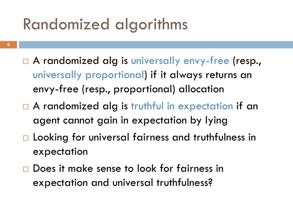 Randomized algorithms • A randomized alg is universally envy-free (resp., universally proportional) if it always returns an envy-free (resp., proportional) allocation • A randomized alg is truthful in expectation if an agent cannot gain in expectation by lying • Looking for universal fairness and truthfulness in expectation • Does it make sense to look for fairness in expectation and universal truthfulness?