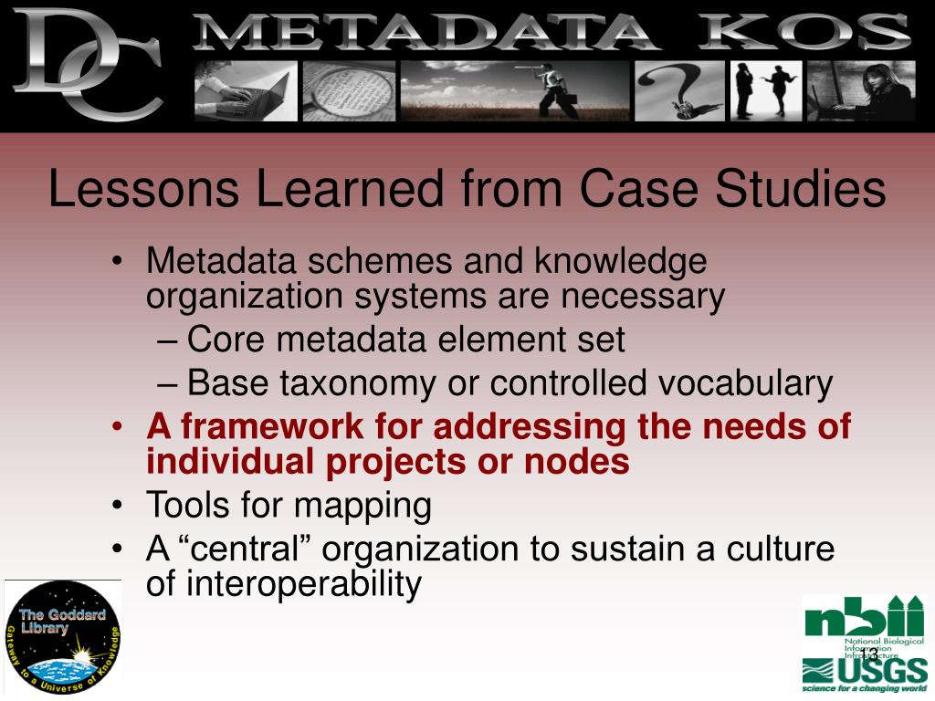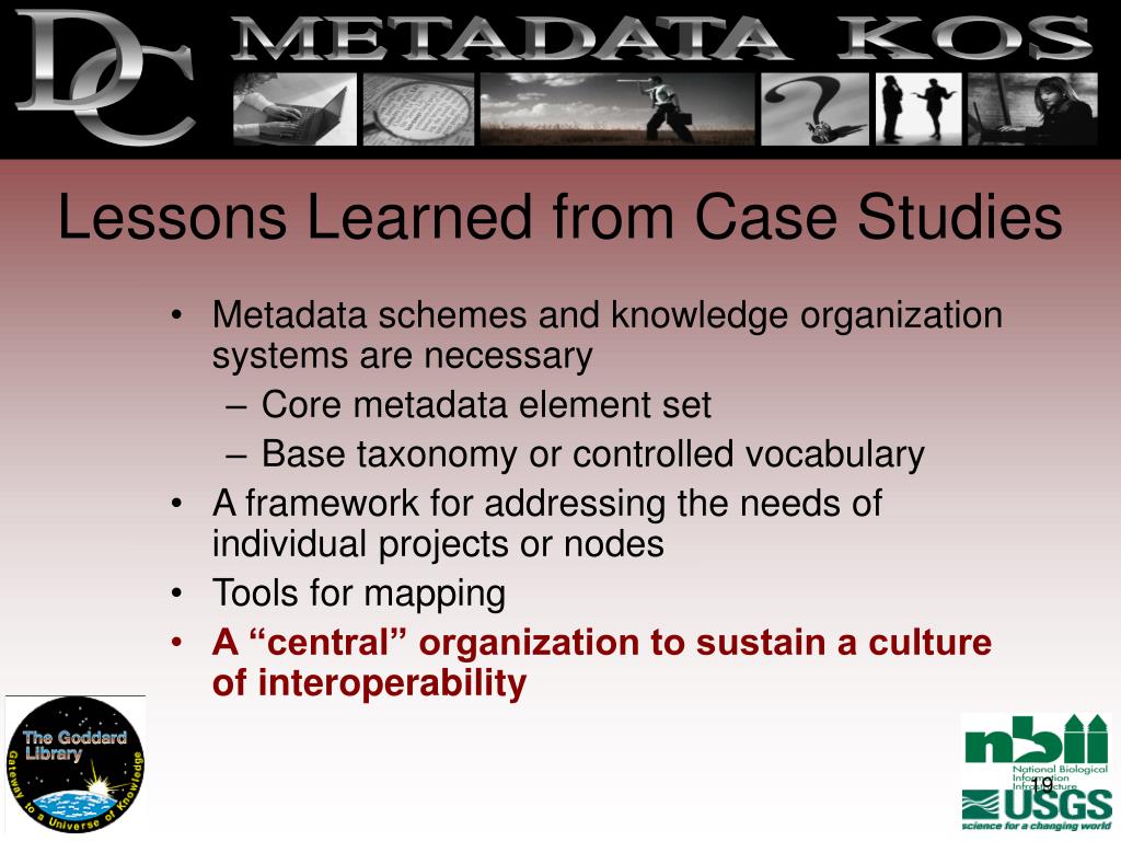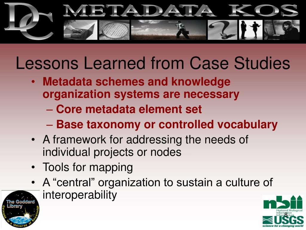 Lessons Learned from Case Studies • Metadata schemes and knowledge organization systems are necessary • Core metadata element set • Base taxonomy or controlled vocabulary • A framework for addressing the needs of individual projects or nodes • Tools for mapping • A “central” organization to sustain a culture of interoperability
