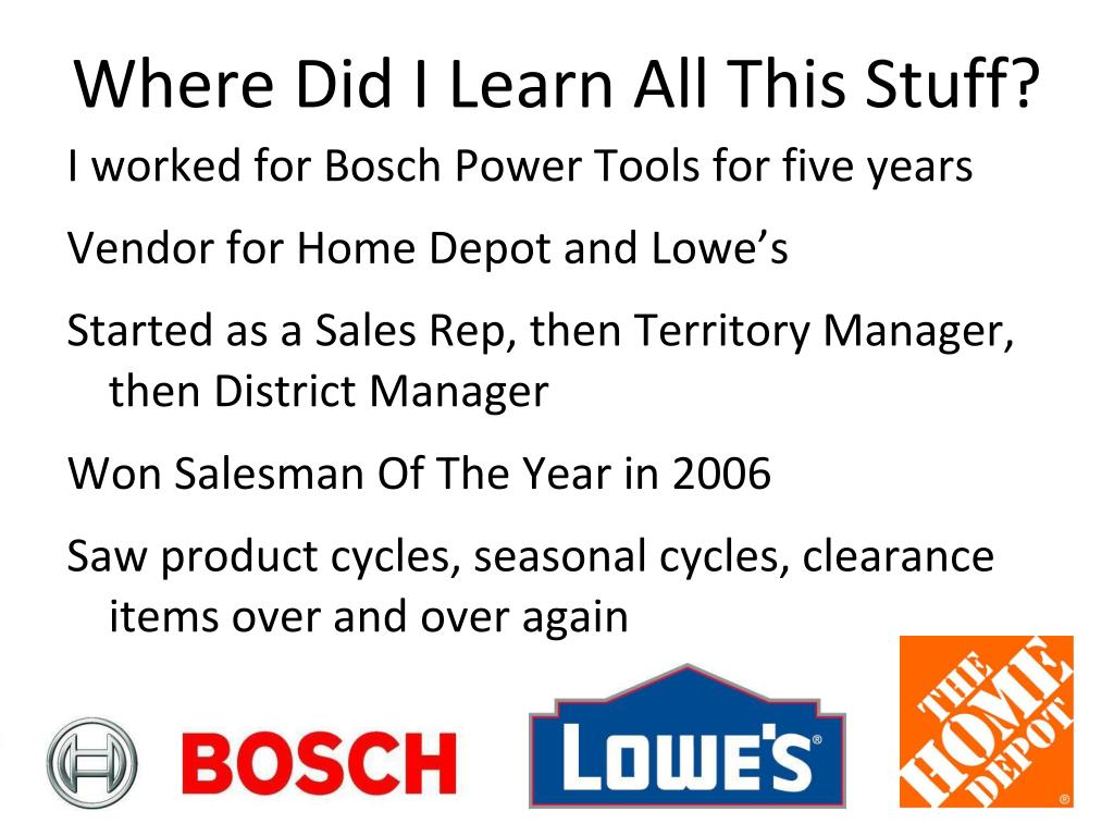 Where Did I Learn All This Stuff? • I worked for Bosch Power Tools for five years • Vendor for Home Depot and Lowe’s • Started as a Sales Rep, then Territory Manager, then District Manager • Won Salesman Of The Year in 2006 • Saw product cycles, seasonal cycles, clearance items over and over again