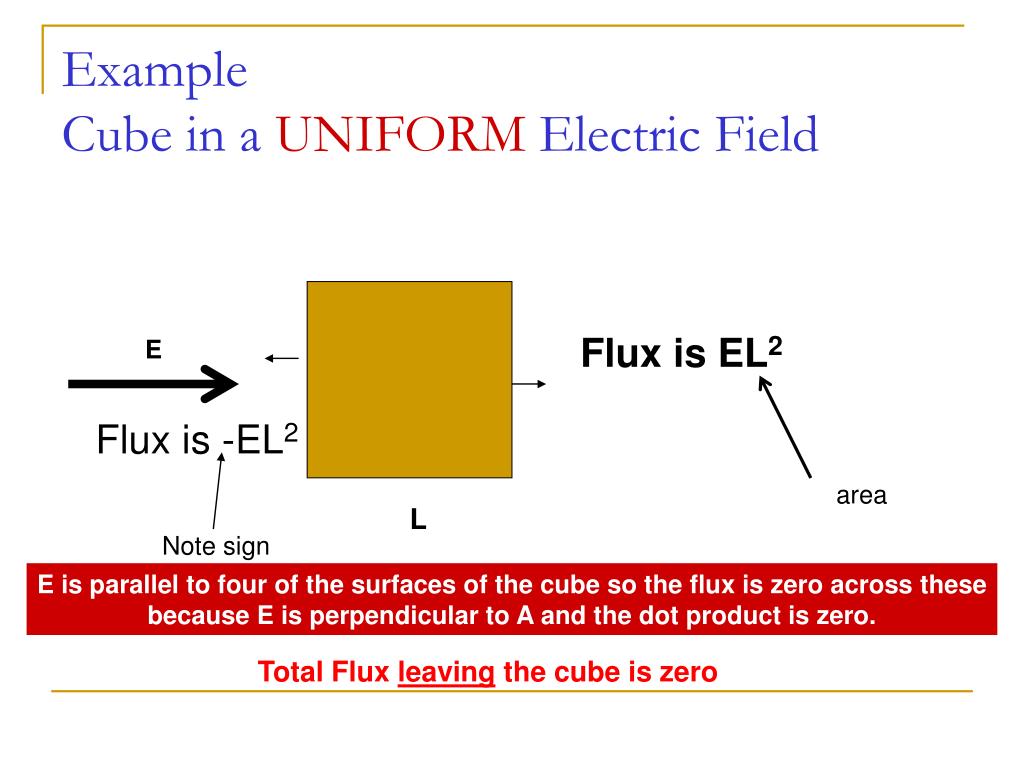 Flux is -EL2 ExampleCube in a UNIFORM Electric Field Flux is EL2 E area L Note sign E is parallel to four of the surfaces of the cube so the flux is zero across these because E is perpendicular to A and the dot product is zero. Total Flux leaving the cube is zero