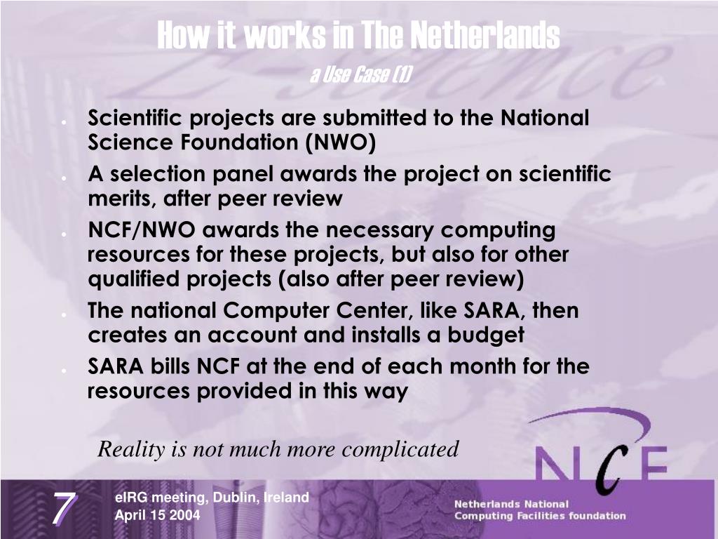 How it works in The Netherlandsa Use Case (1) • Scientific projects are submitted to the National Science Foundation (NWO) • A selection panel awards the project on scientific merits, after peer review • NCF/NWO awards the necessary computing resources for these projects, but also for other qualified projects (also after peer review) • The national Computer Center, like SARA, then creates an account and installs a budget • SARA bills NCF at the end of each month for the resources provided in this way Reality is not much more complicated