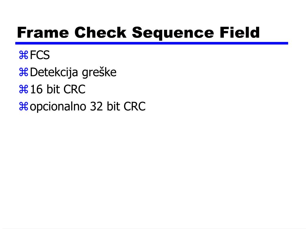 Frame Check Sequence Field • FCS • Detekcija greške • 16 bit CRC • opcionalno 32 bit CRC