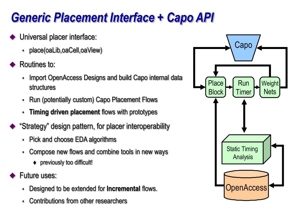 Generic Placement Interface + Capo API • Universal placer interface: • place(oaLib,oaCell,oaView) • Routines to: • Import OpenAccess Designs and build Capo internal data structures • Run (potentially custom) Capo Placement Flows • Timing driven placement flows with prototypes • “Strategy” design pattern, for placer interoperability • Pick and choose EDA algorithms • Compose new flows and combine tools in new ways • previously too difficult! • Future uses: • Designed to be extended for Incremental flows. • Contributions from other researchers