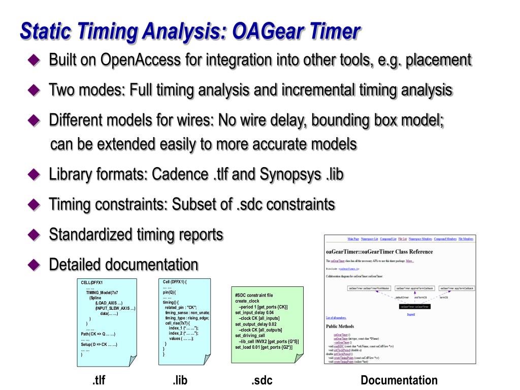 Static Timing Analysis: OAGear Timer • Built on OpenAccess for integration into other tools, e.g. placement • Two modes: Full timing analysis and incremental timing analysis • Different models for wires: No wire delay, bounding box model; can be extended easily to more accurate models • Library formats: Cadence .tlf and Synopsys .lib • Timing constraints: Subset of .sdc constraints • Standardized timing reports • Detailed documentation