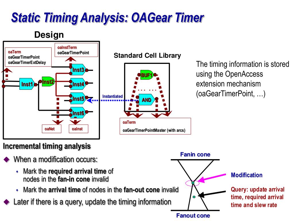 Static Timing Analysis: OAGear Timer Incremental timing analysis • When a modification occurs: • Mark the required arrival time of nodes in the fan-in cone invalid • Mark the arrival time of nodes in the fan-out cone invalid • Later if there is a query, update the timing information The timing information is stored using the OpenAccess extension mechanism (oaGearTimerPoint, …)