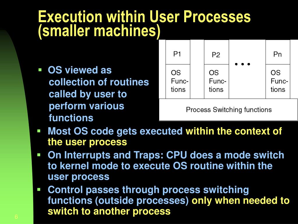 Execution within User Processes (smaller machines) • Most OS code gets executed within the context of the user process • On Interrupts and Traps: CPU does a mode switch to kernel mode to execute OS routine within the user process • Control passes through process switching functions (outside processes) only when needed to switch to another process • OS viewed as collection of routines called by user to perform various functions