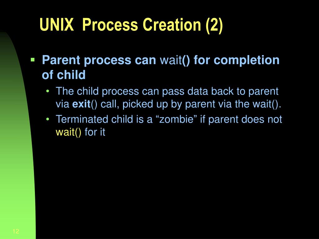 UNIX Process Creation (2) • Parent process can wait() for completion of child • The child process can pass data back to parent via exit() call, picked up by parent via the wait(). • Terminated child is a “zombie” if parent does not wait() for it