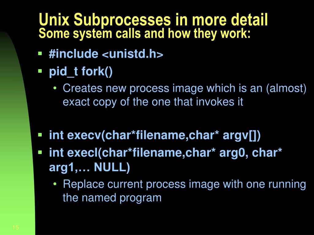 Unix Subprocesses in more detailSome system calls and how they work: • #include <unistd.h> • pid_t fork() • Creates new process image which is an (almost) exact copy of the one that invokes it • int execv(char*filename,char* argv[]) • int execl(char*filename,char* arg0, char* arg1,… NULL) • Replace current process image with one running the named program