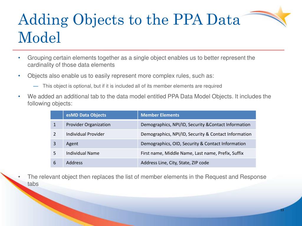 Adding Objects to the PPA Data Model • Grouping certain elements together as a single object enables us to better represent the cardinality of those data elements • Objects also enable us to easily represent more complex rules, such as: • This object is optional, but if it is included all of its member elements are required • We added an additional tab to the data model entitled PPA Data Model Objects. It includes the following objects: • The relevant object then replaces the list of member elements in the Request and Response tabs