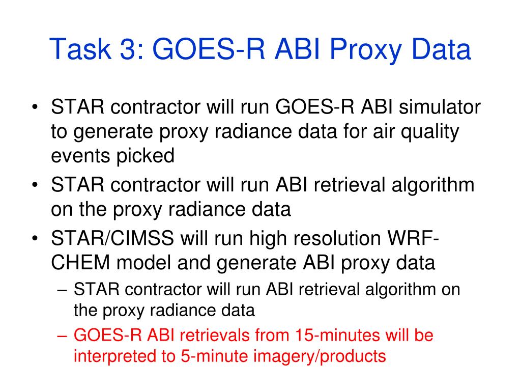 Task 3: GOES-R ABI Proxy Data • STAR contractor will run GOES-R ABI simulator to generate proxy radiance data for air quality events picked • STAR contractor will run ABI retrieval algorithm on the proxy radiance data • STAR/CIMSS will run high resolution WRF-CHEM model and generate ABI proxy data • STAR contractor will run ABI retrieval algorithm on the proxy radiance data • GOES-R ABI retrievals from 15-minutes will be interpreted to 5-minute imagery/products