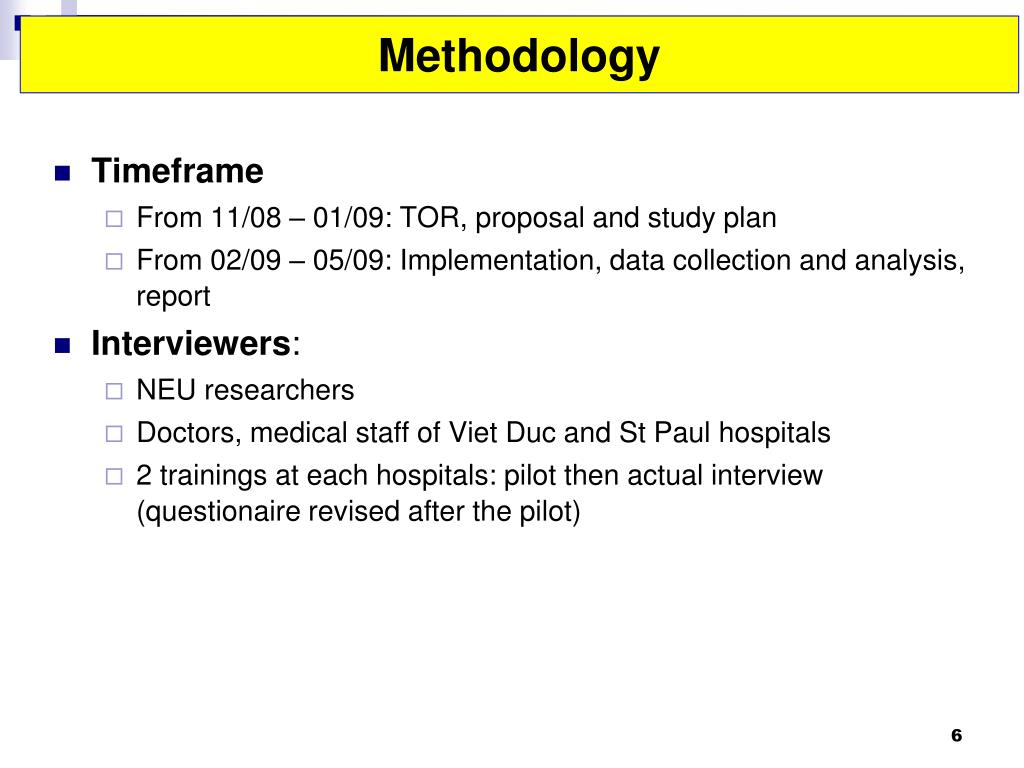 Timeframe From 11/08 – 01/09: TOR, proposal and study plan From 02/09 – 05/09: Implementation, data collection and analysis, report Interviewers: NEU researchers Doctors, medical staff of Viet Duc and St Paul hospitals 2 trainings at each hospitals: pilot then actual interview (questionaire revised after the pilot) Methodology
