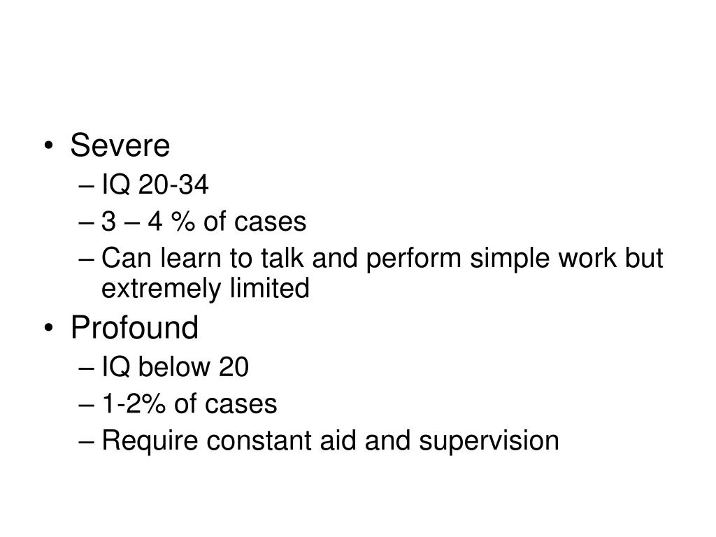 Severe • IQ 20-34 • 3 – 4 % of cases • Can learn to talk and perform simple work but extremely limited • Profound • IQ below 20 • 1-2% of cases • Require constant aid and supervision