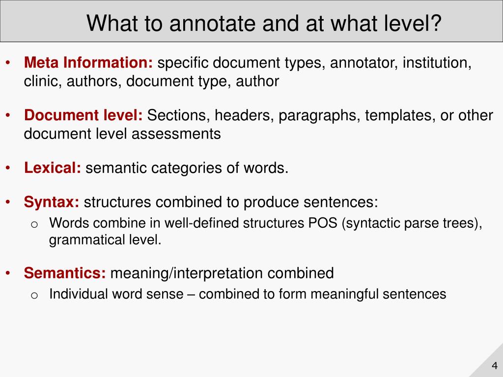 What to annotate and at what level? • Meta Information:specific document types, annotator, institution, clinic, authors, document type, author • Document level: Sections, headers, paragraphs, templates, or other document level assessments • Lexical: semantic categories of words. • Syntax:structures combined to produce sentences: • Words combine in well-defined structures POS (syntactic parse trees), grammatical level. • Semantics:meaning/interpretation combined • Individual word sense – combined to form meaningful sentences