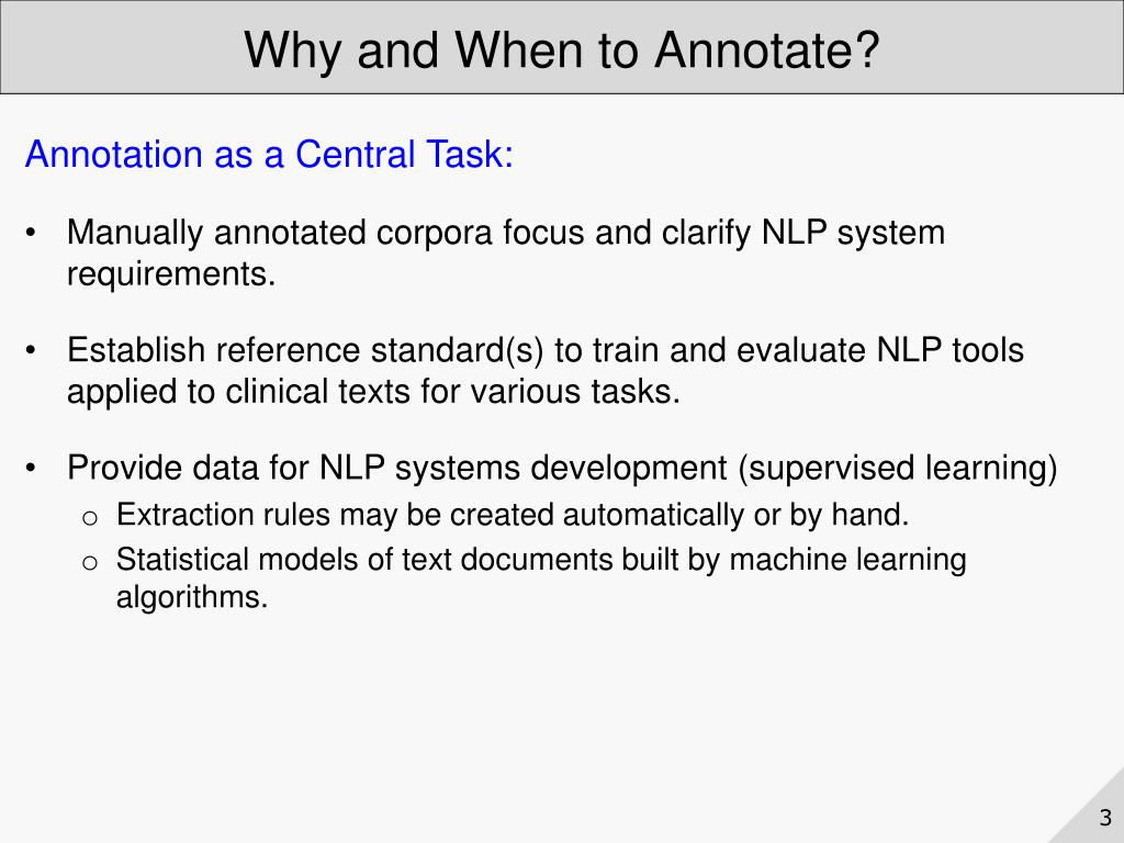 Why and When to Annotate? • Annotation as a Central Task: • Manually annotated corpora focus and clarify NLP system requirements. • Establish reference standard(s) to train and evaluate NLP tools applied to clinical texts for various tasks. • Provide data for NLP systems development (supervised learning) • Extraction rules may be created automatically or by hand. • Statistical models of text documents built by machine learning algorithms.