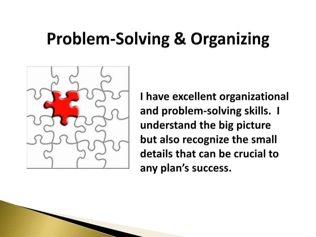 Problem-Solving & Organizing I have excellent organizational and problem-solving skills. I understand the big picture but also recognize the small details that can be crucial to any plan’s success.