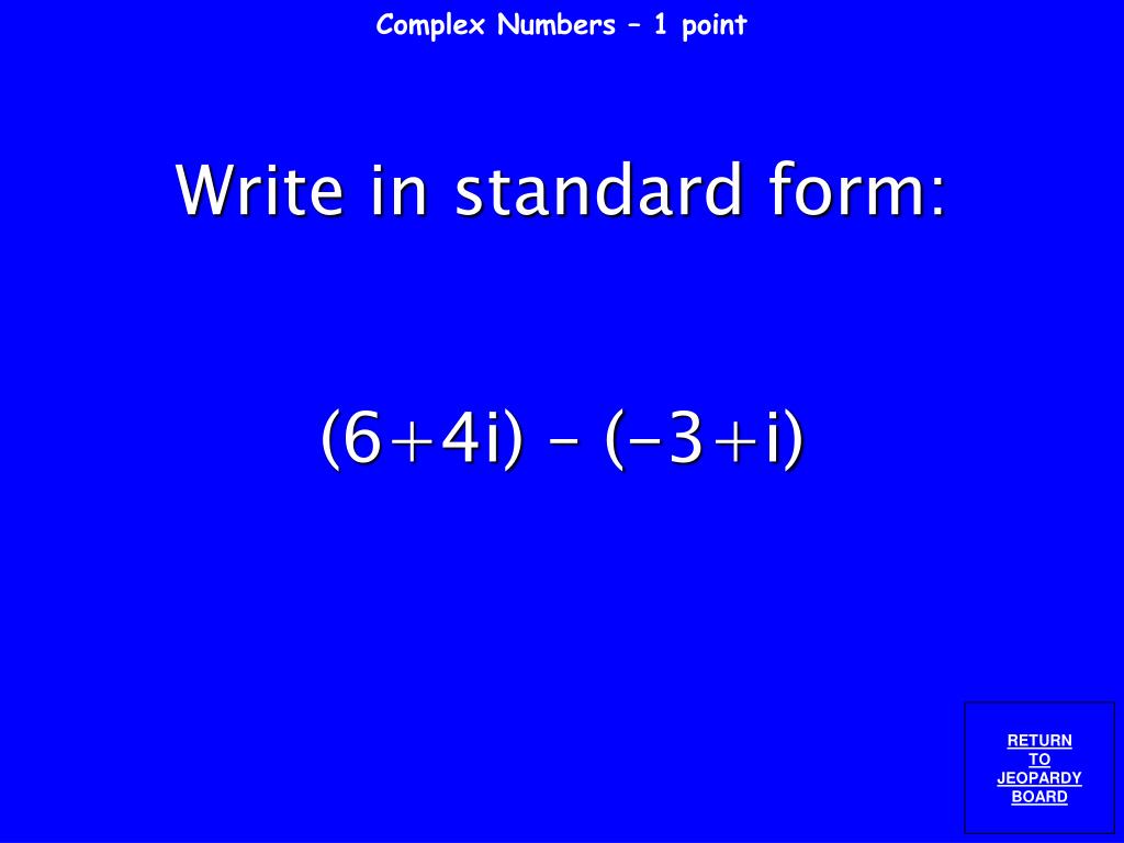 Complex Numbers – 1 point Write in standard form: (6+4i) – (-3+i) RETURN TO JEOPARDY BOARD