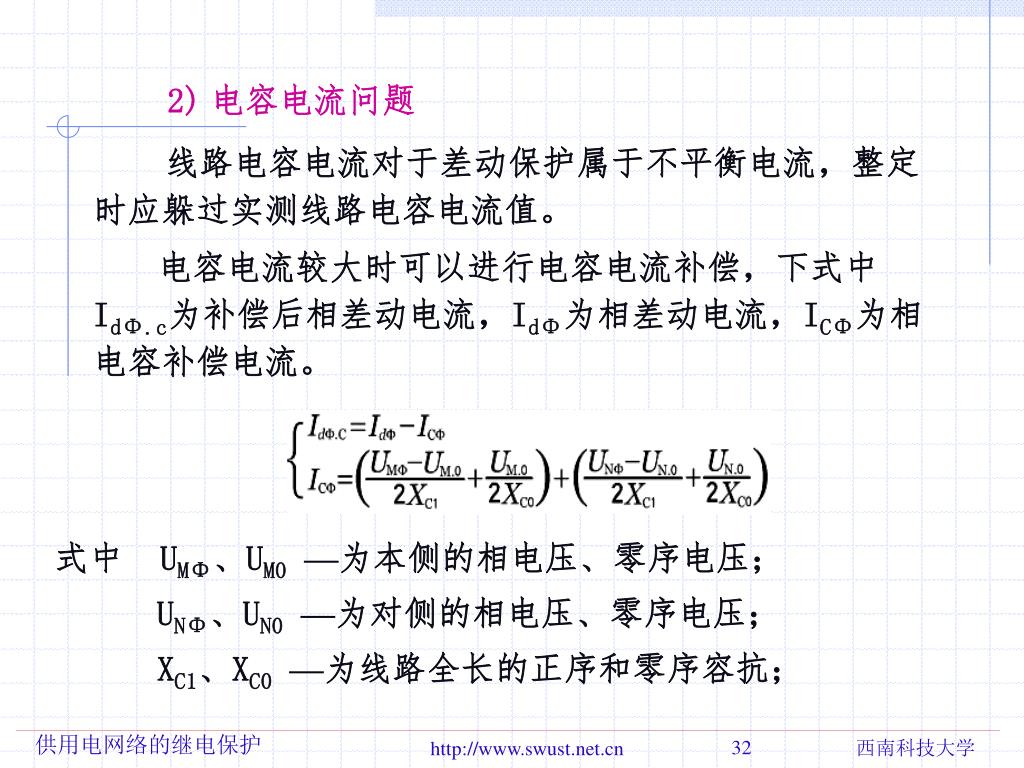 线路电容电流对于差动保护属于不平衡电流,整定时应躲过实测线路电容电流值。线路电容电流对于差动保护属于不平衡电流,整定时应躲过实测线路电容电流值。 电容电流较大时可以进行电容电流补偿,下式中IdΦ.c为补偿后相差动电流,IdΦ为相差动电流,ICΦ为相电容补偿电流。 2)电容电流问题 式中 UMΦ、UM0—为本侧的相电压、零序电压; UNΦ、UN0—为对侧的相电压、零序电压; XC1、XC0—为线路全长的正序和零序容抗;