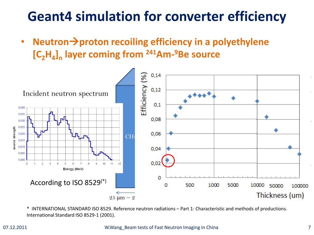 Geant4 simulation for converter efficiency • Neutronproton recoiling efficiency in a polyethylene [C2H4]n layer coming from 241Am-9Be source CH2 gas Incident neutron spectrum 10 cm n n, p 6 cm According to ISO 8529(*) 25 µm ~ 20 cm 1 cm * INTERNATIONAL STANDARD ISO 8529. Reference neutron radiations – Part 1: Characteristic and methods of productions. International Standard ISO 8529-1 (2001). 07.12.2011 W.Wang_Beam tests of Fast Neutron Imaging in China 7