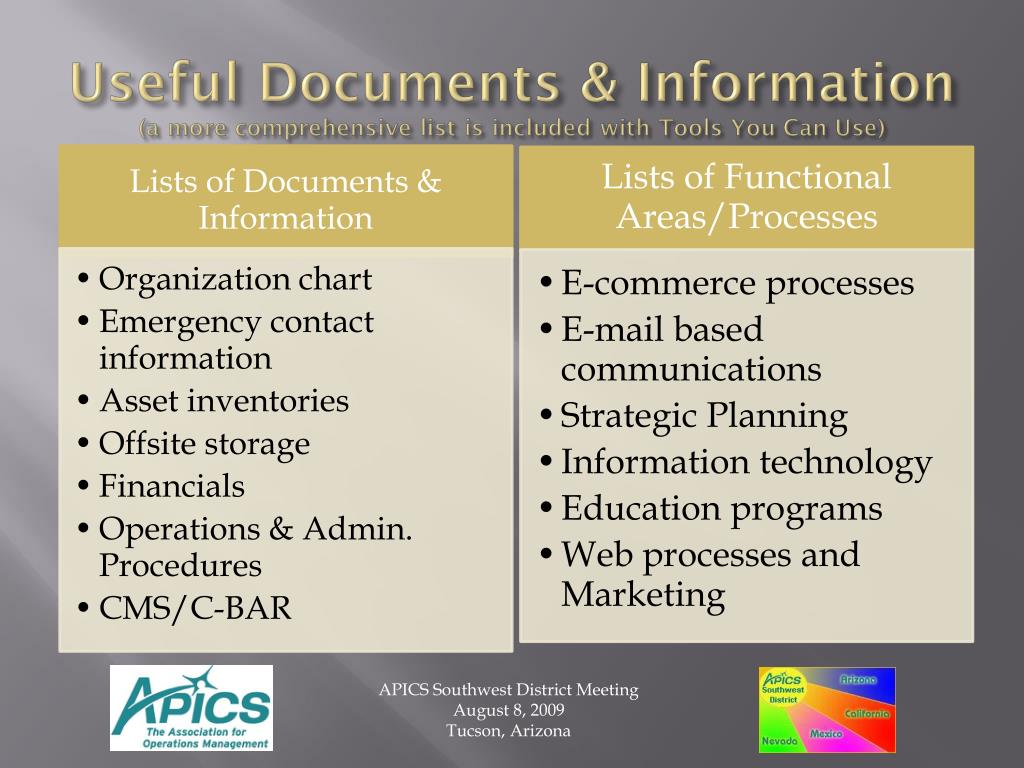 Useful Documents & Information(a more comprehensive list is included with Tools You Can Use) APICS Southwest District Meeting August 8, 2009 Tucson, Arizona