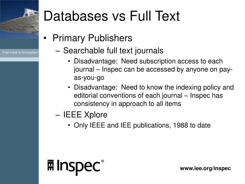 Primary Publishers Searchable full text journals Disadvantage: Need subscription access to each journal – Inspec can be accessed by anyone on pay-as-you-go Disadvantage: Need to know the indexing policy and editorial conventions of each journal – Inspec has consistency in approach to all items IEEE Xplore Only IEEE and IEE publications, 1988 to date Databases vs Full Text