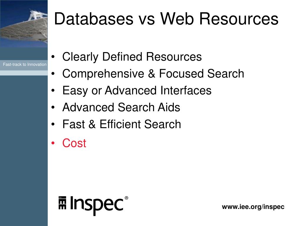 Clearly Defined Resources Comprehensive & Focused Search Easy or Advanced Interfaces Advanced Search Aids Fast & Efficient Search Cost Databases vs Web Resources