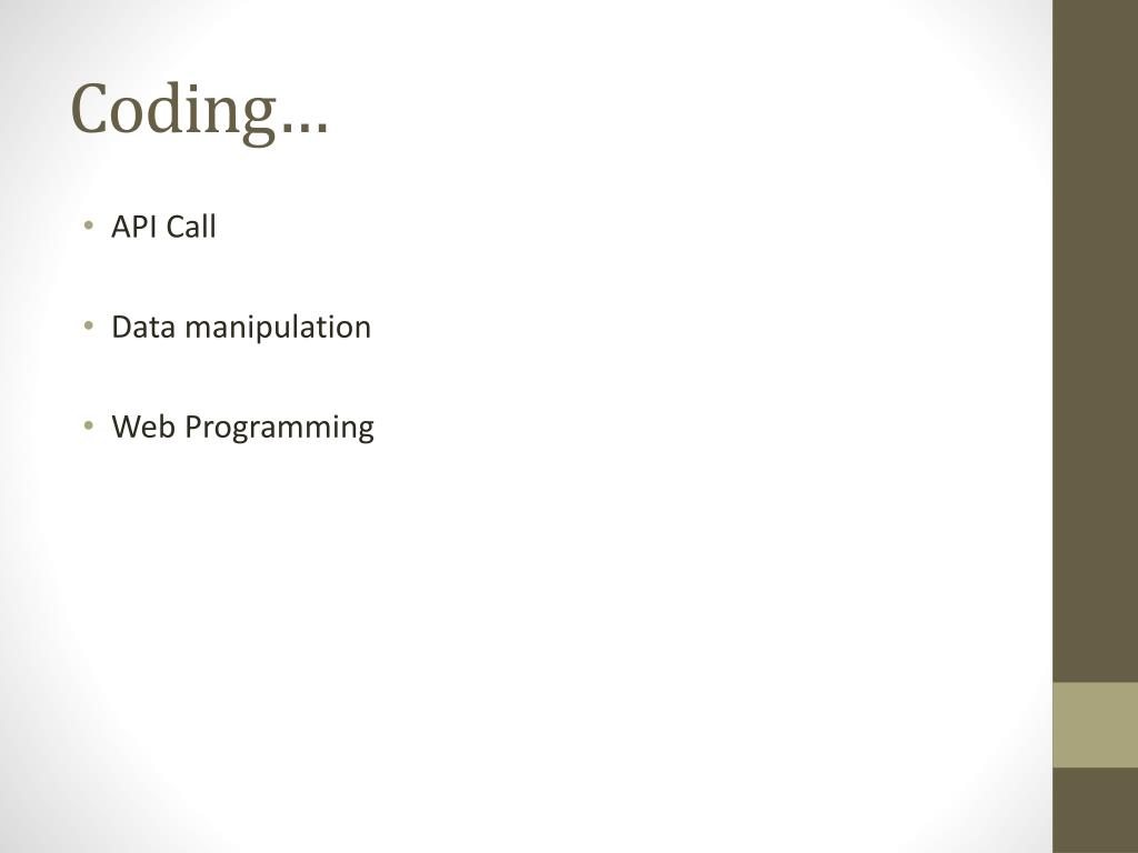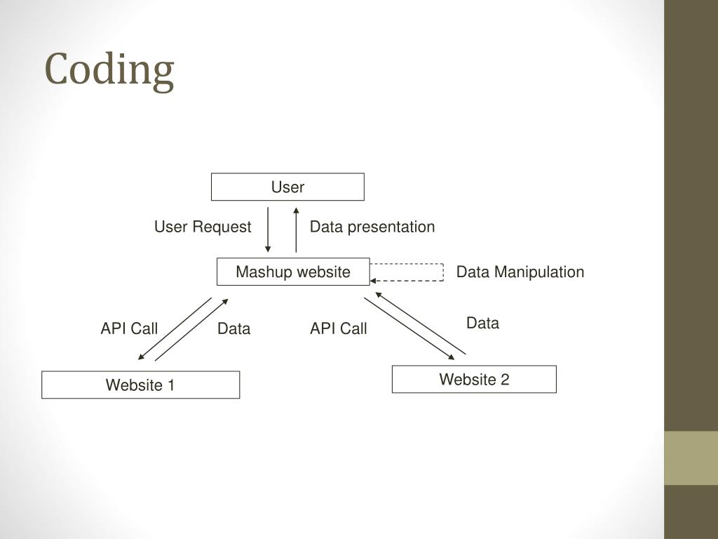 Coding User User Request Data presentation Mashup website Data Manipulation Data API Call Data API Call Website 2 Website 1