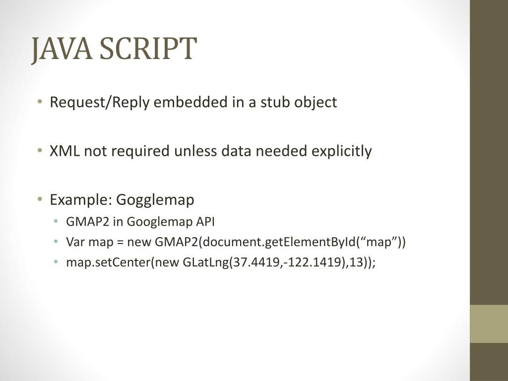 JAVA SCRIPT • Request/Reply embedded in a stub object • XML not required unless data needed explicitly • Example: Gogglemap • GMAP2 in Googlemap API • Var map = new GMAP2(document.getElementById(“map”)) • map.setCenter(new GLatLng(37.4419,-122.1419),13));