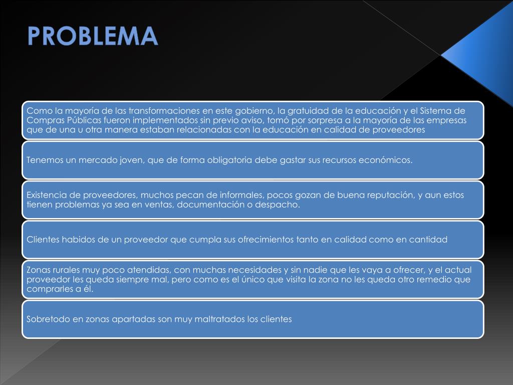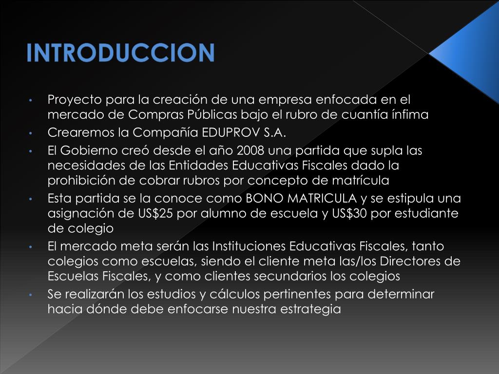INTRODUCCION Proyecto para la creación de una empresa enfocada en el mercado de Compras Públicas bajo el rubro de cuantía ínfima Crearemos la Compañía EDUPROV S.A. El Gobierno creó desde el año 2008 una partida que supla las necesidades de las Entidades Educativas Fiscales dado la prohibición de cobrar rubros por concepto de matrícula Esta partida se la conoce como BONO MATRICULA y se estipula una asignación de US$25 por alumno de escuela y US$30 por estudiante de colegio El mercado meta serán las Instituciones Educativas Fiscales, tanto colegios como escuelas, siendo el cliente meta las/los Directores de Escuelas Fiscales, y como clientes secundarios los colegios Se realizarán los estudios y cálculos pertinentes para determinar hacia dónde debe enfocarse nuestra estrategia