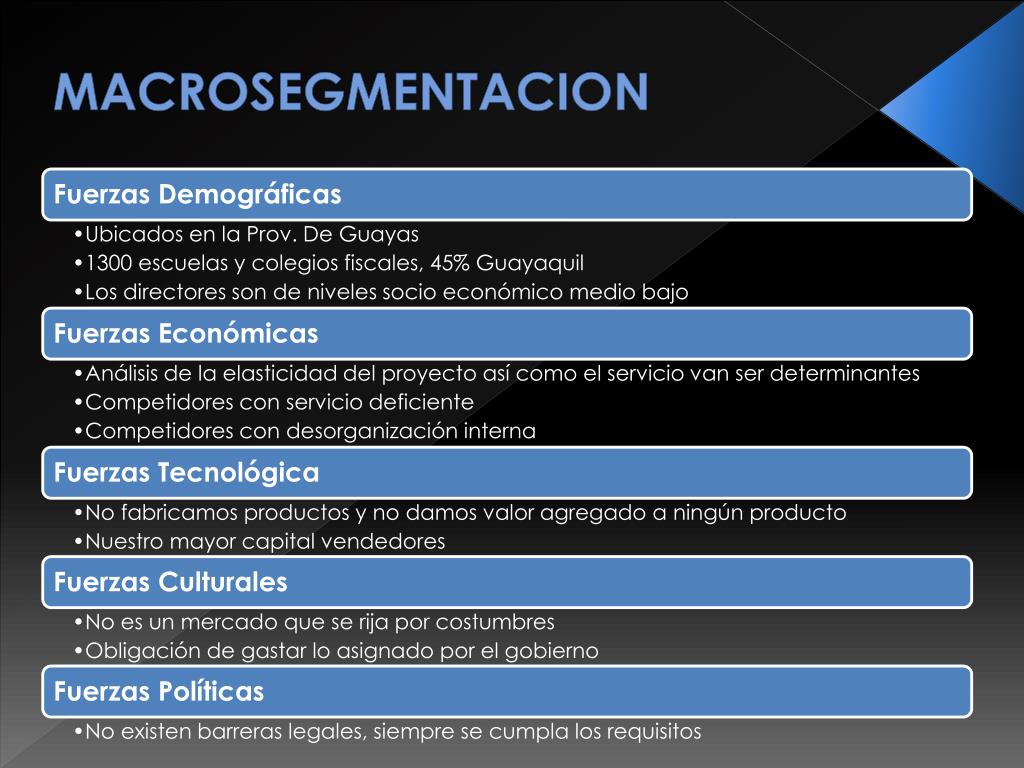 Características del Producto oServicio Oficialmente vendemos productos a las Escuelas y Colegios Fiscales, sin embargo nuestro real atractivo será el servicio Los Productos que venderemos serán en las mismas marcas y presentaciones que tienen las otras empresas de este mercado Buscaremos diferenciación desde la primera etapa, la venta; se contratará personal con el perfil adecuado para tratar con Directores(as) que en promedio sobrepasan los 40 años, con muy poco tiempo para atender vendedores y con mucho estrés encima. La correcta presentación lingüística del producto así como TODOS los detalles que a él conciernen, por ejemplo; un pedido de bancas debe especificar, si se requieren de metal o madera, si son de metal especificar si es con ángulo o tubo, si es con tubo especificar si es redondo o cuadrado, si las sentadera, respaldar y posamano son de madera o metal mismo, color de la banca, medidas y grosor del tubo o ángulo Todos estos detalles son importantes, pues es la única forma de evitar problemas futuros con lo clientes.