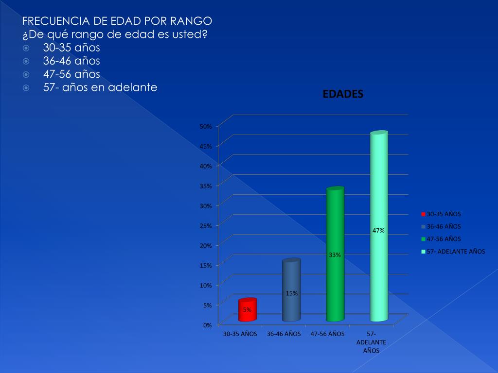 FRECUENCIA DE EDAD POR RANGO ¿De qué rango de edad es usted? • 30-35 años • 36-46 años • 47-56 años • 57- años en adelante