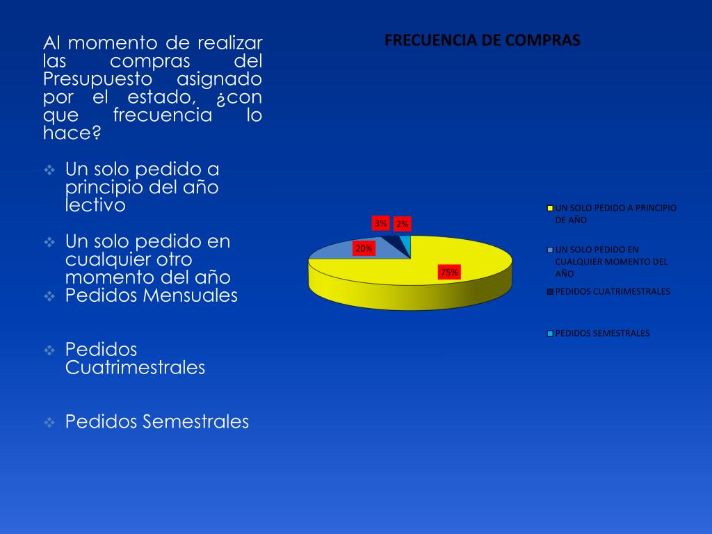 Al momento de realizar las compras del Presupuesto asignado por el estado, ¿con que frecuencia lo hace? Un solo pedido a principio del año lectivo Un solo pedido en cualquier otro momento del año Pedidos Mensuales Pedidos Cuatrimestrales Pedidos Semestrales