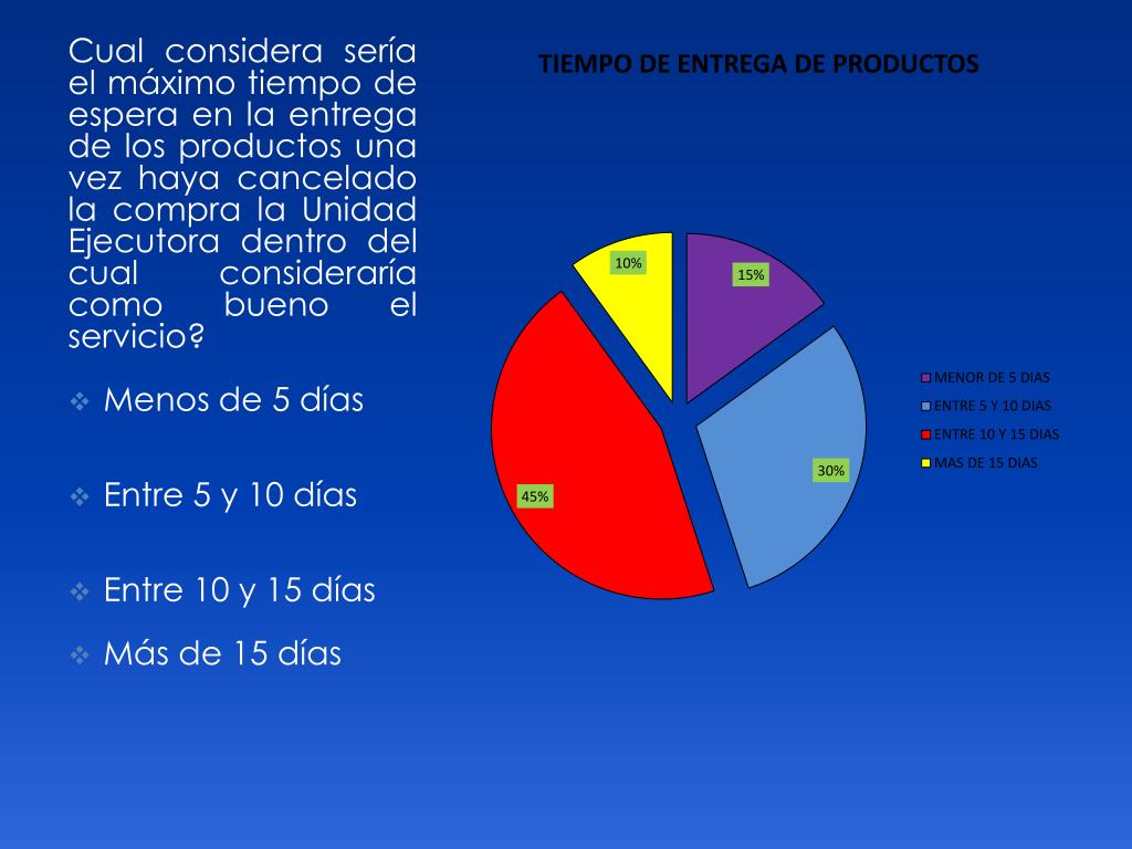 Cual considera sería el máximo tiempo de espera en la entrega de los productos una vez haya cancelado la compra la Unidad Ejecutora dentro del cual consideraría como bueno el servicio? Menos de 5 días Entre 5 y 10 días Entre 10 y 15 días Más de 15 días