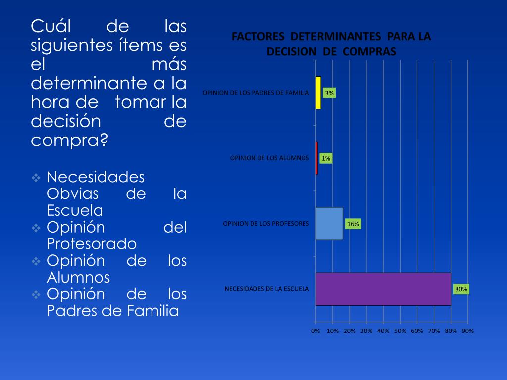 Cuál de las siguientes ítems es el más determinante a la hora de tomar la decisión de compra? Necesidades Obvias de la Escuela Opinión del Profesorado Opinión de los Alumnos Opinión de los Padres de Familia