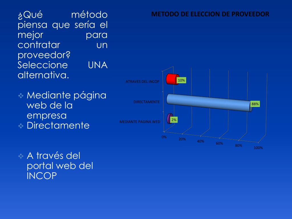 ¿Qué método piensa que sería el mejor para contratar un proveedor? Seleccione UNA alternativa. Mediante página web de la empresa Directamente A través del portal web del INCOP