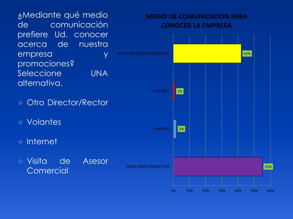 CONCLUSION DEL ANALISIS ESTADISTICO Hemos determinado que la mayoría de nuestros clientes son mujeres mayores de 46 años de edad Prefieren enterarse de la existencia de este tipo de empresa y de su eficiencia por medio de otros colegas directores No les gusta elegir mediante portales de internet Prefieren la visita de un asesor comercial que las atienda de manera personalizada Les gusta invertir en tecnología dado que prefieren estar a la vanguardia en cuanto a equipamiento de su Institución Basan su decisión de compra en las necesidades visibles de la escuela Un solo pedido a principio de año Los tiempos de entrega son importantes Les gusta tener todo en orden y que los despachos sean en forma organizada, es decir que no sean incompletos, que todo lo que se haya facturado sea entregado en un solo envión