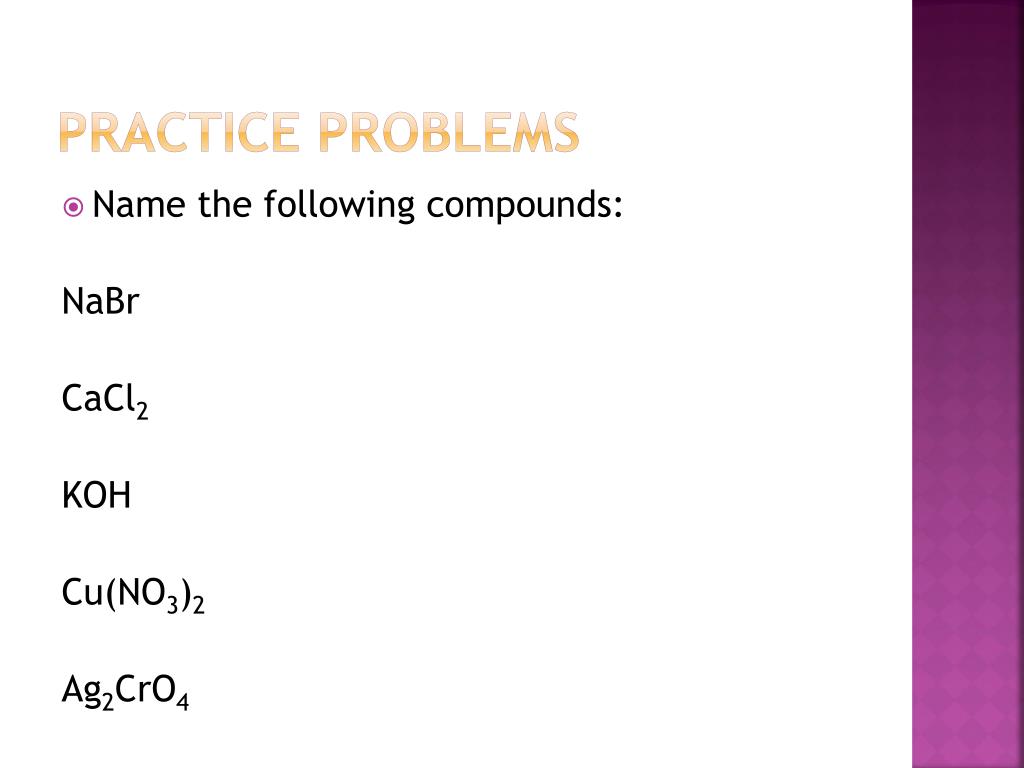 Practice problems • Name the following compounds: NaBr CaCl2 KOH Cu(NO3)2 Ag2CrO4