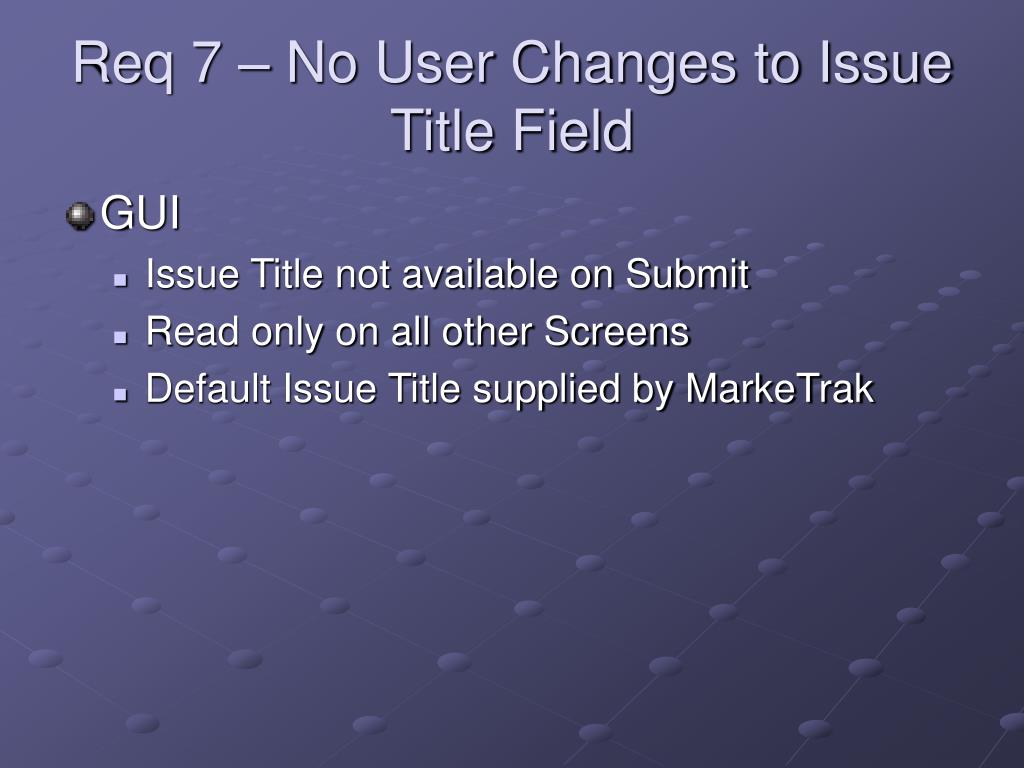 Req 7 – No User Changes to Issue Title Field • GUI • Issue Title not available on Submit • Read only on all other Screens • Default Issue Title supplied by MarkeTrak