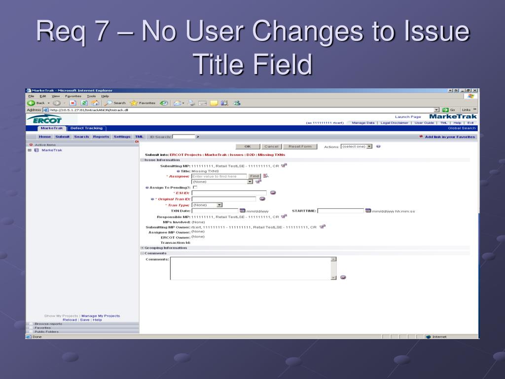 MarkeTrak Phase 2a. Technical Walk Through. Req 7 – No User Changes to Issue Title Field. GUI Issue Title not available on Submit Read only on all other Screens Default Issue Title supplied by MarkeTrak. Req 7 – No User Changes to Issue Title Field.