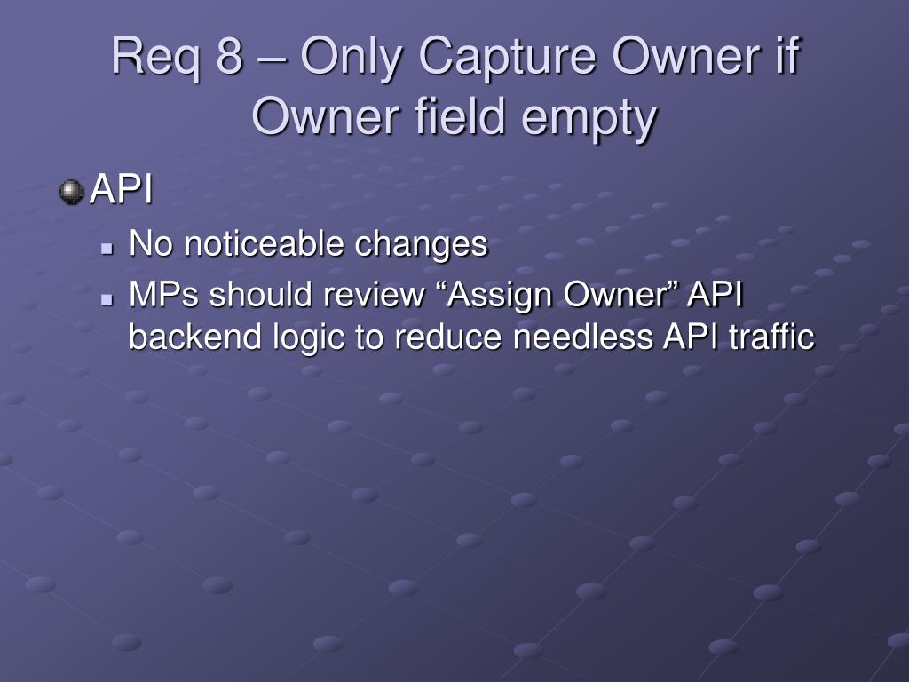 Req 8 – Only Capture Owner if Owner field empty • API • No noticeable changes • MPs should review “Assign Owner” API backend logic to reduce needless API traffic