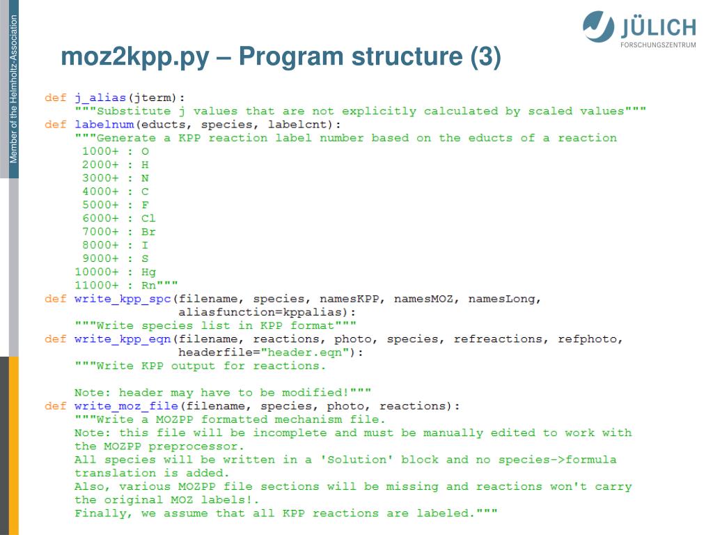 Design goalsof moz2kpp.py • Automatictranslationoffull gas-phase mechanismtoavoiderrors • Useconsistentnamingofspeciesandreaction tags wherepossible • Try todocumentspeciesandreactions (andpreservedocumentation) • Maketool easy touse