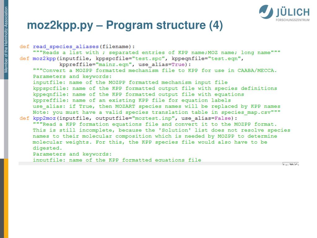 moz2kpp.py (2) • Arguments andkeywordsofmoz2kppfunction: • inputfile: name of the MOZPP formatted mechanism input file • kppspcfile: name of the KPP formatted output file with species definitions (*.spc) • kppeqnfile: name of the KPP formatted output file with equations (*.eqn) • kppreffile: name of an existing KPP file for equation labels • use_alias: if True, then MOZART species names will be replaced by KPP names • Note: you must have a valid species translation table in species_map.csv