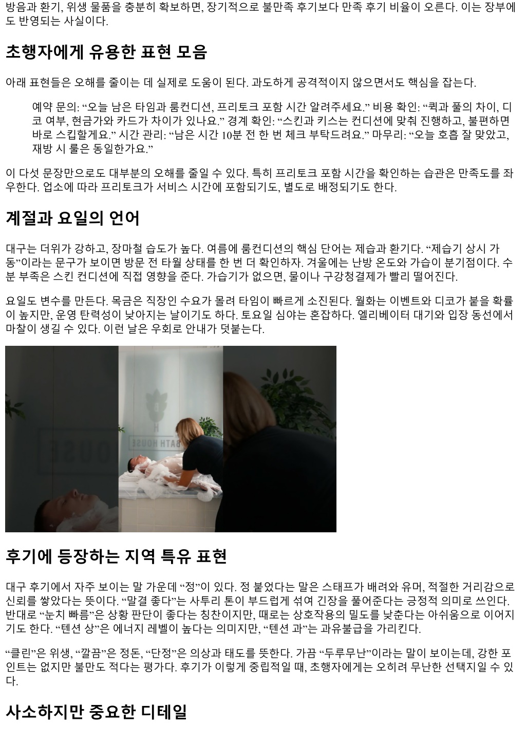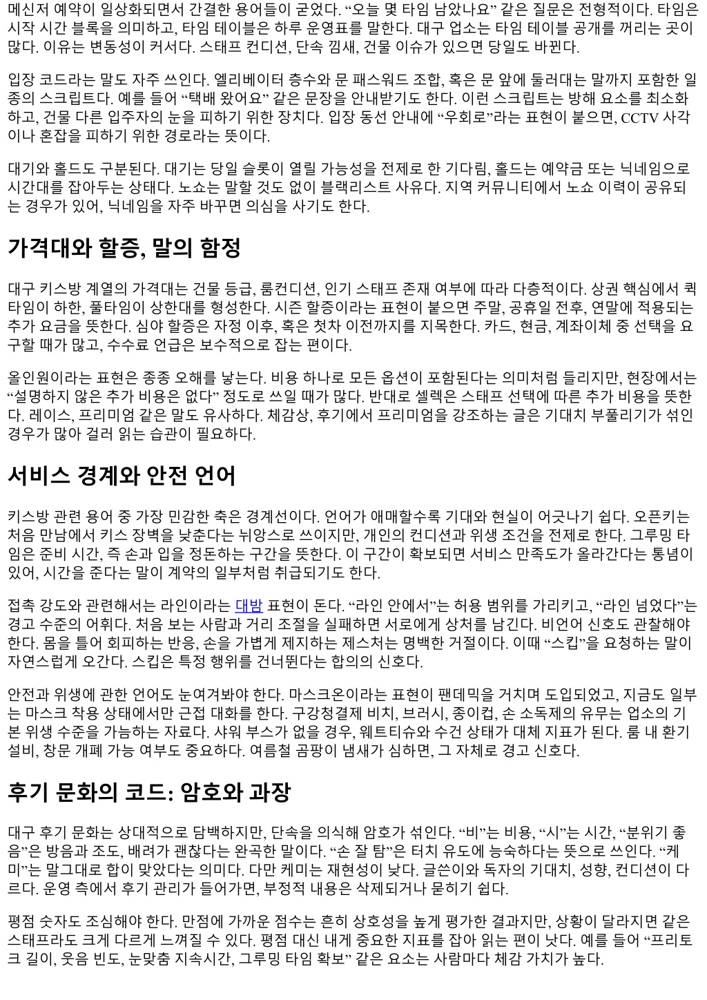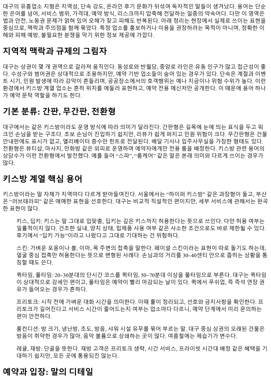 대구의유흥업소지형은지역성, 단속강도, 온라인후기문화가뒤섞여독자적인말들이생겨났다. 용어는단순 한은어를넘어, 서비스범위, 가격대, 예약방식, 리스크까지압축해전달하는일종의약속어다. 다만이영역은 법과안전, 노동권문제가얽혀있어오해가잦고피해도반복된다. 아래정리는현장에서실제로쓰이는표현을 중심으로, 맥락과주의점을함께묶었다. 특정업소를홍보하거나이용을권장하려는목적이아니며, 정확한이 해와피해예방, 불필요한분쟁을막기위한정보제공에가깝다. 지역적맥락과규제의그림자 대구는상권이몇개권역으로갈라져움직인다. 동성로와반월당, 중앙로라인은유동인구가많고접근성이좋 다. 수성구와범어권은상대적으로조용하지만, 예약기반업소들이숨어있는경우가있다. 단속은계절과이벤 트시기, 민원발생에따라강약이흔들리며, 공공장소에서의호객행위는예나지금이나위험수위가높다. 이런 환경에서키스방계열업소는흔히위치를에둘러표현하고, 예약전용메신저만공개한다. 이때문에용어하나 가예약문턱역할을하기도한다. 기본분류: 간판, 무간판, 전환형 대구에서는같은키스방이라도운영방식에따라의미가달라진다. 간판형은길목에눈에띄는표식을두고워 크인손님을받는구조다. 초보손님이진입하기쉽지만, 리뷰가쉽게퍼지고민원위험이크다. 무간판형은건물 안내판에도표시가없고, 엘리베이터층수만힌트로전달된다. 배달기사나입주사무실을가장한형태도있다. 전환형은뷰티샵, 마사지, 만화방같은외피로운영하며예약자에게만전용룸을배정한다. 키스방관련용어의 상당수가이런전환형에서발전했다. 예를들어 “스파”, “룸케어” 같은말은본래의미와다르게쓰이는경우가 많다. 키스방계열핵심용어 키스방이라는말자체가지역마다다르게받아들여진다. 서울에서는 “하이퍼키스방” 같은과장형이돌고, 부산 은 “러브테라피” 같은애매한표현을선호한다. 대구는비교적직설적인편이지만, 세부서비스에관해서는완곡 한표현이많다. 키스, 딥키: 키스는말그대로입맞춤, 딥키는깊은키스까지허용한다는뜻으로쓰인다. 다만허용여부는 일률적이지않다. 건조한실내, 양치상태, 립제품사용여부같은사소한조건으로도바로제한될수있다. 후기에서 “딥키가능”이라고나왔다고그대로기대하는건위험하다. 스킨: 가벼운포옹이나볼, 이마, 목주변의접촉을말한다. 페이셜스킨이라는표현이따로돌기도하는데, 얼굴중심접촉만허용한다는뜻으로변형된사례다. 손님과의거리를 30~40센티안으로좁히는상황을통 칭할때도쓴다. 퀵타임, 풀타임: 20~30분대의단시간코스를퀵타임, 50~70분대이상을풀타임으로부른다. 대구는퀵타임 이상대적으로강세인편이고, 풀타임은예약이빨리마감되는날이있다. 퀵에서푸쉬업, 즉즉석연장권 유가들어오는경우가흔하다. 프리토크: 시작전에가벼운대화시간을의미한다. 이때룰이정리되고, 선호와금지사항을확인한다. 프 리토크가길어진다고서비스시간이줄어드는지여부는업소마다다르니, 예약단계에서미리문의하는 편이안전하다. 룸컨디션: 방크기, 냉난방, 조도, 방음, 샤워시설유무를묶어부르는말. 대구중심상권의오래된건물은 방음이취약한경우가많아, 음악볼륨으로상쇄하는곳이많다. 여름철에는제습기가변수다. 레귤, 재방: 단골을뜻한다. 재방고객은프리토크생략, 시간서비스, 프라이빗시간대배정같은혜택을기 대하기쉽지만, 모든곳에통용되진않는다. 예약과입장: 말의디테일