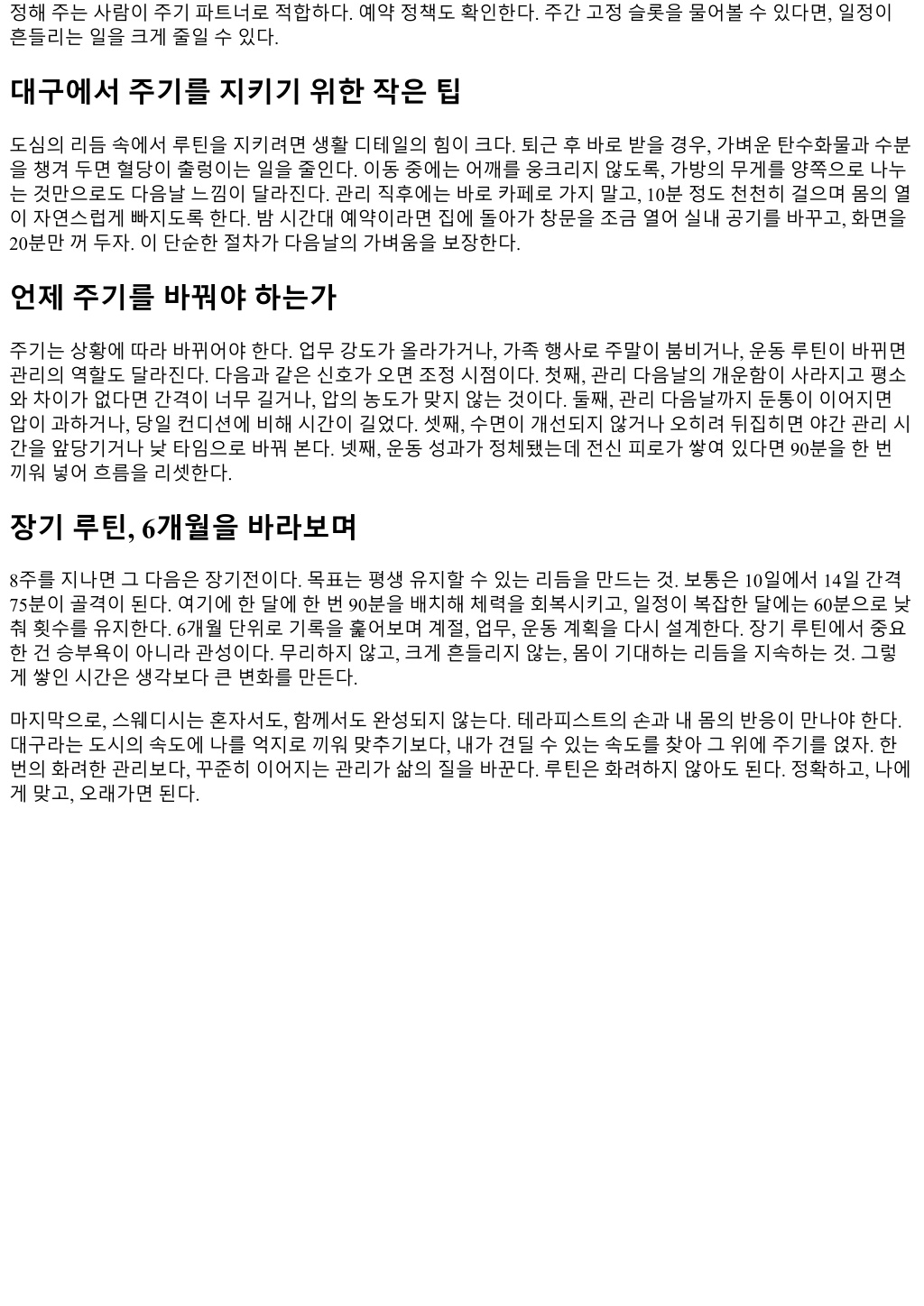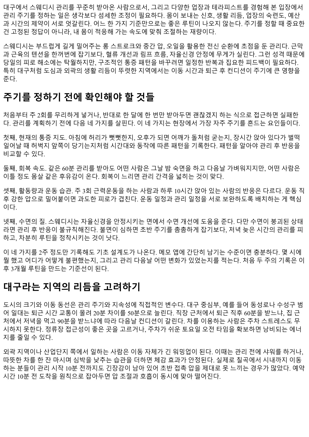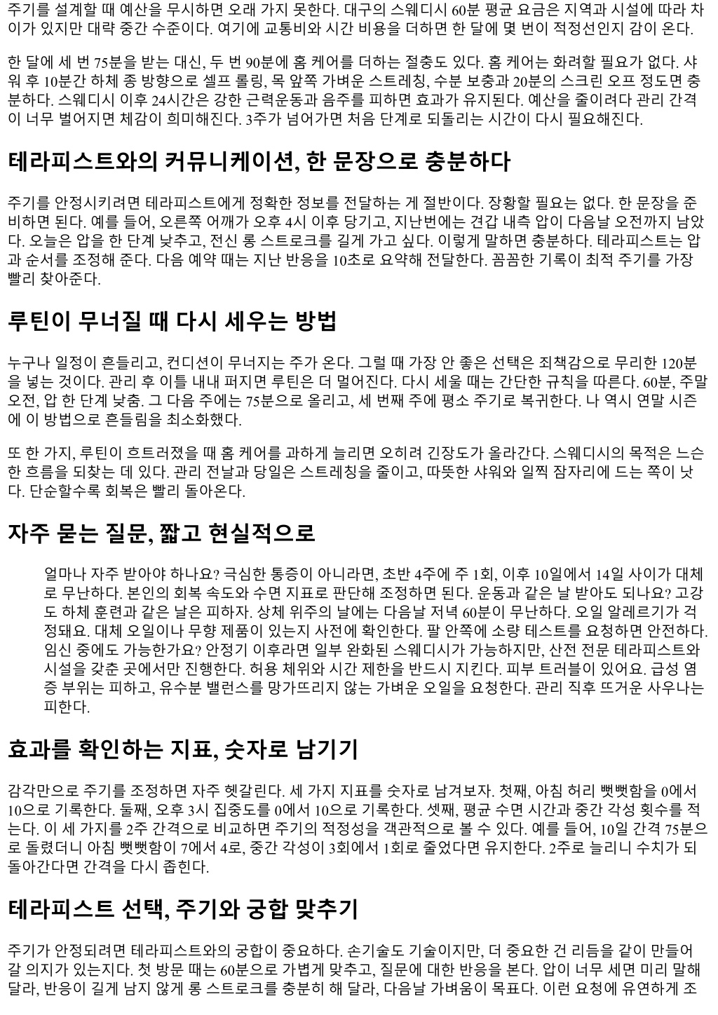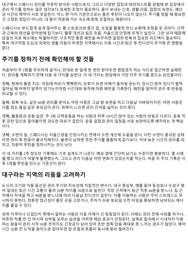 주기를설계할때예산을무시하면오래가지못한다. 대구의스웨디시 60분평균요금은지역과시설에따라차 이가있지만대략중간수준이다. 여기에교통비와시간비용을더하면한달에몇번이적정선인지감이온다. 한달에세번 75분을받는대신, 두번 90분에홈케어를더하는절충도있다. 홈케어는화려할필요가없다. 샤 워후 10분간하체종방향으로셀프롤링, 목앞쪽가벼운스트레칭, 수분보충과 20분의스크린오프정도면충 분하다. 스웨디시이후 24시간은강한근력운동과음주를피하면효과가유지된다. 예산을줄이려다관리간격 이너무벌어지면체감이희미해진다. 3주가넘어가면처음단계로되돌리는시간이다시필요해진다. 테라피스트와의커뮤니케이션, 한문장으로충분하다 주기를안정시키려면테라피스트에게정확한정보를전달하는게절반이다. 장황할필요는없다. 한문장을준 비하면된다. 예를들어, 오른쪽어깨가오후 4시이후당기고, 지난번에는견갑내측압이다음날오전까지남았 다. 오늘은압을한단계낮추고, 전신롱스트로크를길게가고싶다. 이렇게말하면충분하다. 테라피스트는압 과순서를조정해준다. 다음예약때는지난반응을 10초로요약해전달한다. 꼼꼼한기록이최적주기를가장 빨리찾아준다. 루틴이무너질때다시세우는방법 누구나일정이흔들리고, 컨디션이무너지는주가온다. 그럴때가장안좋은선택은죄책감으로무리한 120분 을넣는것이다. 관리후이틀내내퍼지면루틴은더멀어진다. 다시세울때는간단한규칙을따른다. 60분, 주말 오전, 압한단계낮춤. 그다음주에는 75분으로올리고, 세번째주에평소주기로복귀한다. 나역시연말시즌 에이방법으로흔들림을최소화했다. 또한가지, 루틴이흐트러졌을때홈케어를과하게늘리면오히려긴장도가올라간다. 스웨디시의목적은느슨 한흐름을되찾는데있다. 관리전날과당일은스트레칭을줄이고, 따뜻한샤워와일찍잠자리에드는쪽이낫 다. 단순할수록회복은빨리돌아온다. 자주묻는질문, 짧고현실적으로 얼마나자주받아야하나요? 극심한통증이아니라면, 초반 4주에주 1회, 이후 10일에서 14일사이가대체 로무난하다. 본인의회복속도와수면지표로판단해조정하면된다. 운동과같은날받아도되나요? 고강 도하체훈련과같은날은피하자. 상체위주의날에는다음날저녁 60분이무난하다. 오일알레르기가걱 정돼요. 대체오일이나무향제품이있는지사전에확인한다. 팔안쪽에소량테스트를요청하면안전하다. 임신중에도가능한가요? 안정기이후라면일부완화된스웨디시가가능하지만, 산전전문테라피스트와 시설을갖춘곳에서만진행한다. 허용체위와시간제한을반드시지킨다. 피부트러블이있어요. 급성염 증부위는피하고, 유수분밸런스를망가뜨리지않는가벼운오일을요청한다. 관리직후뜨거운사우나는 피한다. 효과를확인하는지표, 숫자로남기기 감각만으로주기를조정하면자주헷갈린다. 세가지지표를숫자로남겨보자. 첫째, 아침허리뻣뻣함을 0에서 10으로기록한다. 둘째, 오후 3시집중도를 0에서 10으로기록한다. 셋째, 평균수면시간과중간각성횟수를적 는다. 이세가지를 2주간격으로비교하면주기의적정성을객관적으로볼수있다. 예를들어, 10일간격 75분으 로돌렸더니아침뻣뻣함이 7에서 4로, 중간각성이 3회에서 1회로줄었다면유지한다. 2주로늘리니수치가되 돌아간다면간격을다시좁힌다. 테라피스트선택, 주기와궁합맞추기 주기가안정되려면테라피스트와의궁합이중요하다. 손기술도기술이지만, 더중요한건리듬을같이만들어 갈의지가있는지다. 첫방문때는 60분으로가볍게맞추고, 질문에대한반응을본다. 압이너무세면미리말해 달라, 반응이길게남지않게롱스트로크를충분히해달라, 다음날가벼움이목표다. 이런요청에유연하게조