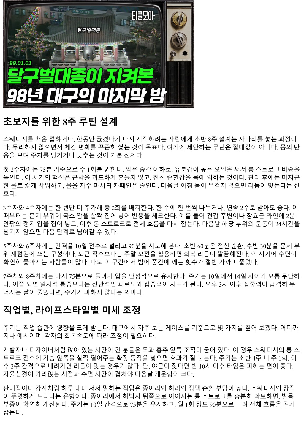 초보자를위한 8주루틴설계 스웨디시를처음접하거나, 한동안끊겼다가다시시작하려는사람에게초반 8주설계는사다리를놓는과정이 다. 무리하지않으면서체감변화를꾸준히쌓는것이목표다. 여기에제안하는루틴은절대값이아니다. 몸의반 응을보며주차를당기거나늦추는것이기본전제다. 첫 2주차에는 75분기준으로주 1회를권한다. 압은중간이하로, 유분감이높은오일을써서롱스트로크비중을 높인다. 이시기의핵심은근막을과도하게흔들지않고, 전신순환감을몸에익히는것이다. 관리후에는미지근 한물로짧게샤워하고, 물을자주마시되카페인은줄인다. 다음날아침몸이무겁지않으면리듬이맞는다는신 호다. 3주차와 4주차에는한번만더추가해총 2회를배치한다. 한주에한번씩나누거나, 연속 2주로받아도좋다. 이 때부터는문제부위에국소압을살짝집어넣어반응을체크한다. 예를들어견갑주변이나장요근라인에 2분 안팎의정지압을집어넣고, 이후롱스트로크로전체흐름을다시잡는다. 다음날해당부위의둔통이 24시간을 넘기지않으면다음단계로넘어갈수있다. 5주차와 6주차에는간격을 10일전후로벌리고 90분을시도해본다. 초반 60분은전신순환, 후반 30분을문제부 위재점검에쓰는구성이다. 퇴근직후보다는주말오전을활용하면회복리듬이깔끔해진다. 이시기에수면이 확연히좋아지는사람들이많다. 나도이구간에서밤에중간에깨는횟수가절반가까이줄었다. 7주차와 8주차에는다시 75분으로돌아가압을안정적으로유지한다. 주기는 10일에서 14일사이가보통무난하 다. 이쯤되면일시적통증보다는전반적인피로도와집중력이지표가된다. 오후 3시이후집중력이급격히무 너지는날이줄었다면, 주기가과하지않다는의미다. 직업별, 라이프스타일별미세조정 주기는직업습관에영향을크게받는다. 대구에서자주보는케이스를기준으로몇가지를짚어보겠다. 어디까 지나예시이며, 각자의회복속도에따라조정이필요하다. 개발자나디자이너처럼앉아있는시간이긴분들은목과흉추앞쪽조직이굳어있다. 이경우스웨디시의롱스 트로크전후에가슴앞쪽을살짝열어주는확장동작을넣으면효과가잘붙는다. 주기는초반 4주내주 1회, 이 후 2주간격으로내려가면리듬이맞는경우가많다. 단, 야근이잦다면밤 10시이후타임은피하는편이좋다. 자율신경이가라앉는시점과수면시간이겹쳐야다음날개운함이크다. 판매직이나강사처럼하루내내서서말하는직업은종아리와허리의정맥순환부담이높다. 스웨디시의장점 이뚜렷하게드러나는유형이다. 종아리에서허벅지뒤쪽으로이어지는롱스트로크를충분히확보하면, 발목 부종이확연히개선된다. 주기는 10일간격으로 75분을유지하고, 월 1회정도 90분으로늘려전체흐름을길게 잡는다.